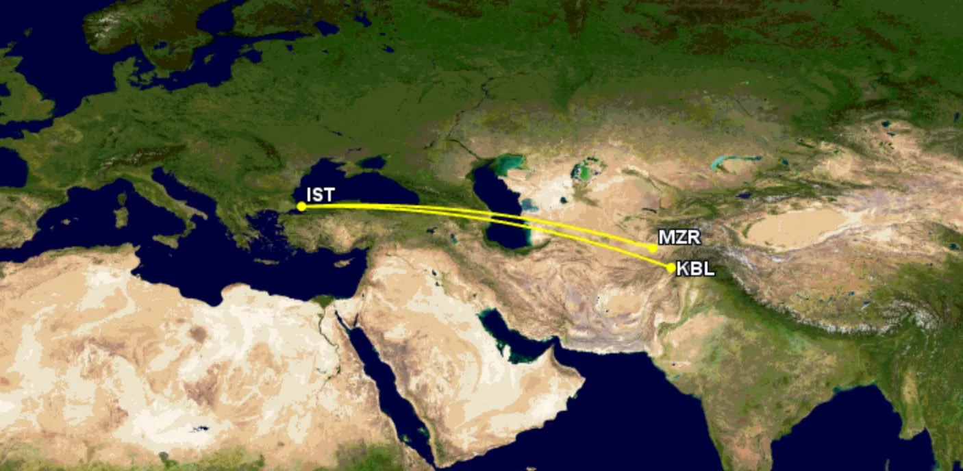 • Mazār-i-Sharīf to Istanbul Airport: TK737, 07:00-10:40 (5h 10m)